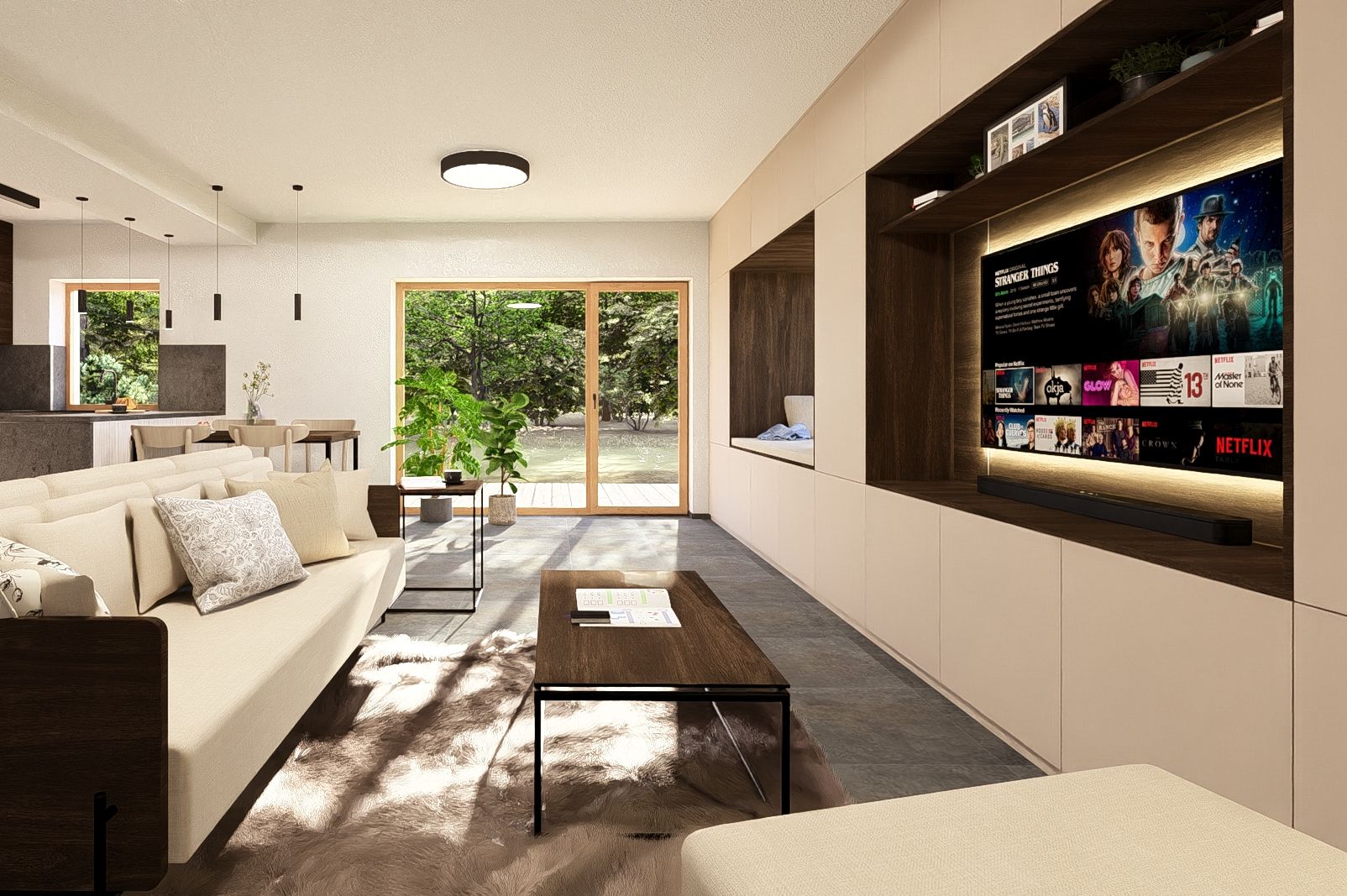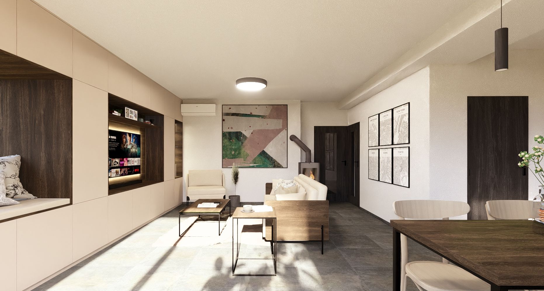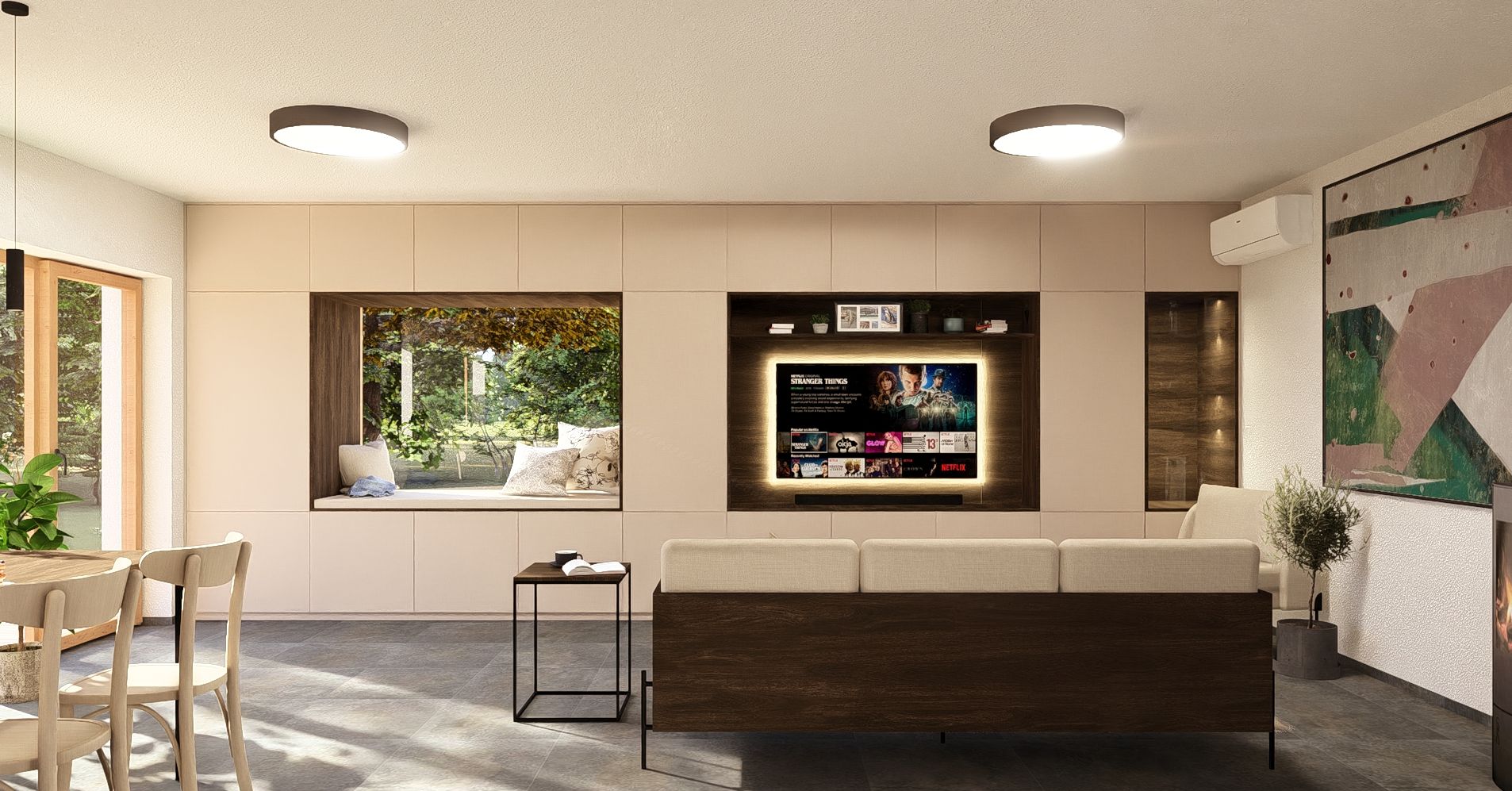 Centrální obytný prostor spojuje kuchyni, jídelnu a obývací pokoj do jednoho kompaktního celku, ve kterém je kladen důraz na jednoduchost, přehlednost a přirozené světlo. Stěna s integrovaným úložným systémem elegantně skrývá funkční zázemí a zároveň vytváří ucelené pozadí pro odpočinkovou část. Televizní panel z tmavého dřeva je orámován ambientním osvětlením, které navozuje příjemnou večerní atmosféru.